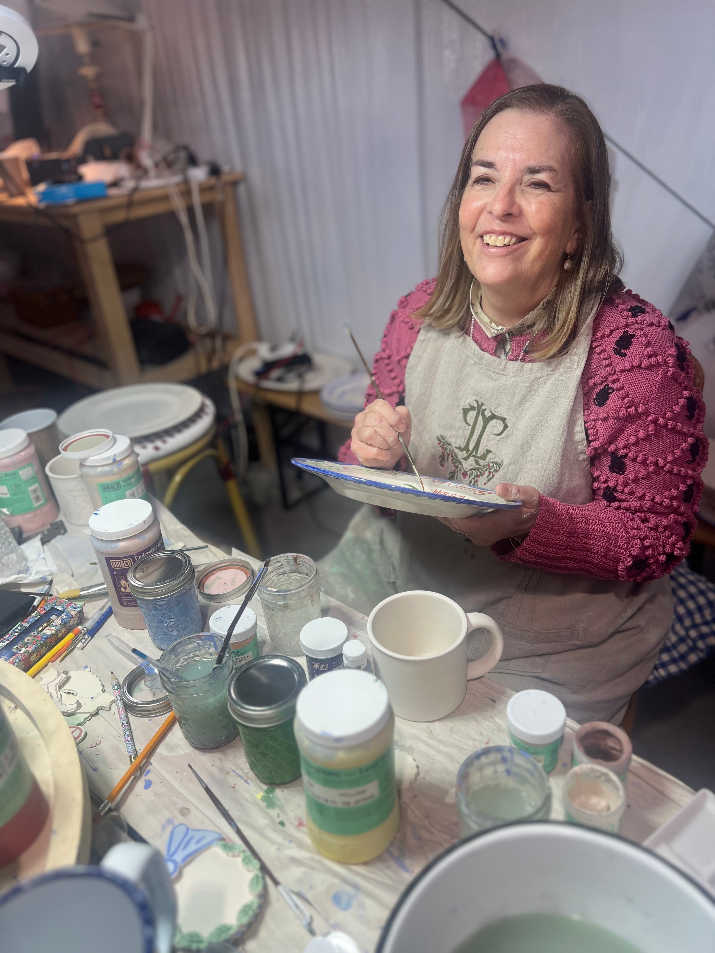Tricia Lowenfield is a self-taught artist and designer creating pieces in a whimsical European folk art style. She works in a variety of art media, specializing in but not limited to ceramics. She loves functional art, so many pieces tell a story on a handpainted plate or platter, bowl or tile. She considers each piece to be a canvas on which to create a memory. Her pieces are cherished by her customers and considered heirlooms to pass down over the years.